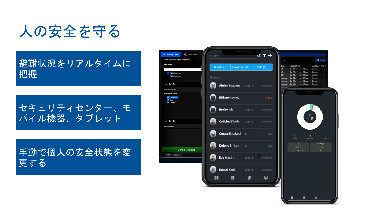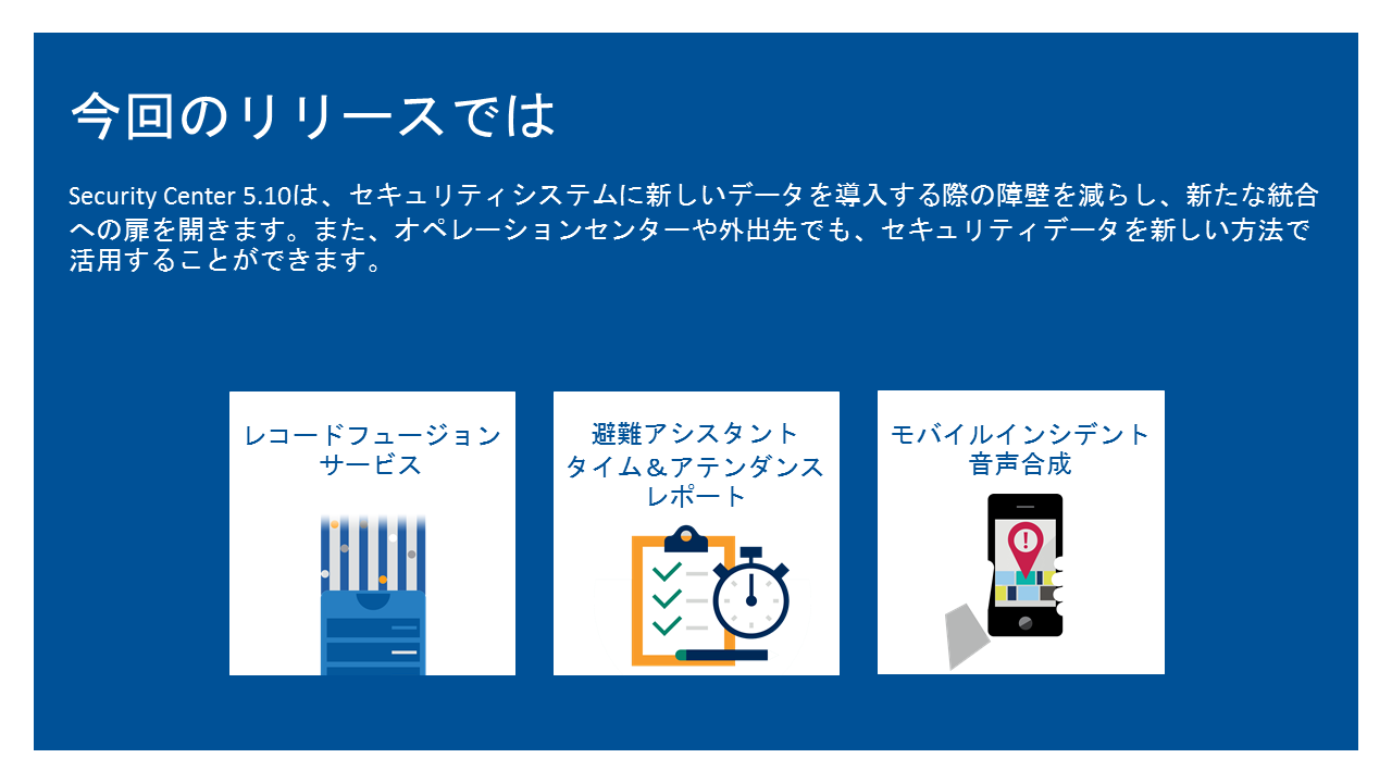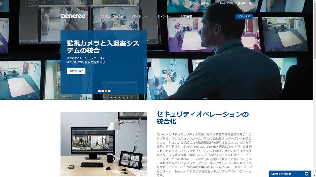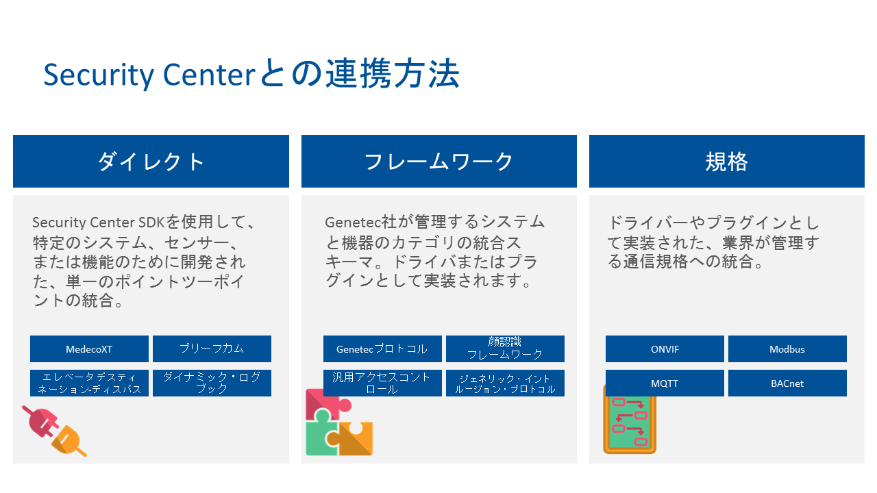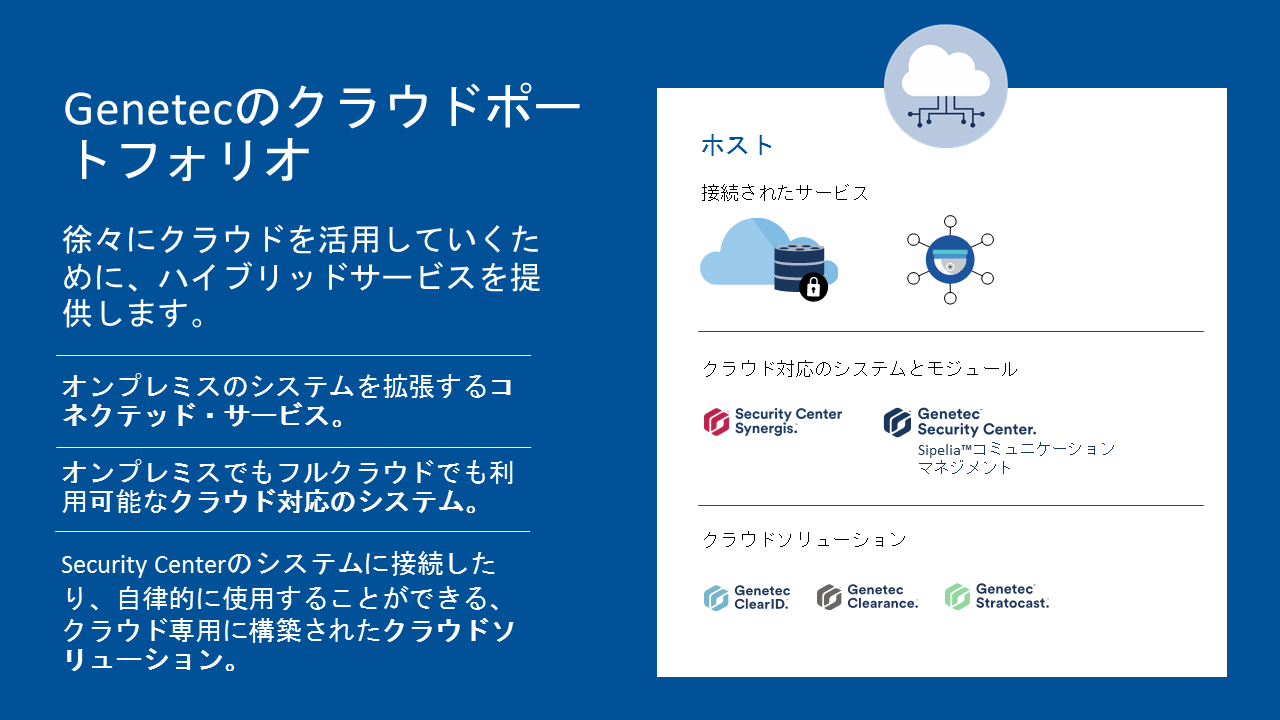 Security Center (セキュリティセンター)は、IP セキュリティ監視システムをシンプルで直感的なインターフェースに統合することにより、セキュリティ運用の負荷の低減を実現したGenetec 社の総合セキュリティプラットフォームです。入退室管理、ビデオ監視、自動ナンバープレート認識から、コミュニケーション、侵入検知、ビデオ分析まで、Security Center は正確な状況の把握、統合された指揮統制やクラウド接続などの優れた機能で企業・組織を強化します。
